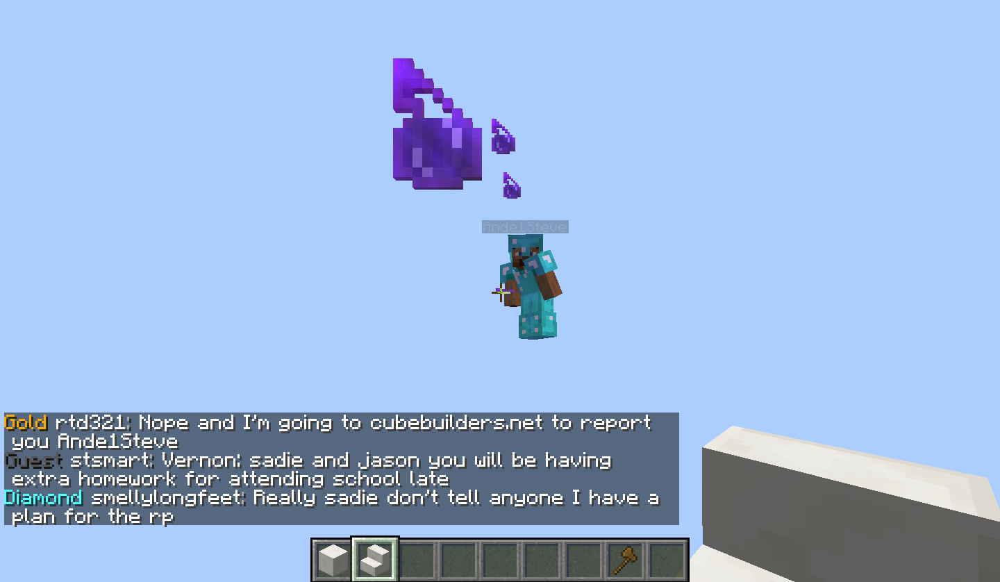 Today at 5:28 pm eastern time exactly i banned and1steve from my plot because he was throwing ghast tears on my property and blocking the way so i couldnt build on my plot. I banned him from my plot then he started to throw potions onto my plot and said he wouldnt stop till i undenied him. I refused to so he kept throwing potions while im reporting him right now. Evidence is below.