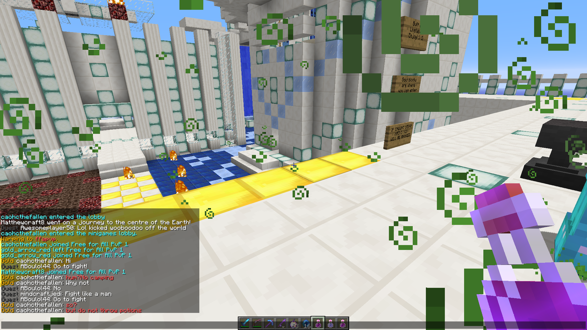 Thanks for the post. Fortunately, when Livetabon made the new FFA arena, I gave her the idea to make multiple entry points. It is not illegal to throw potions at spawn gates, and since there are 4 of them, camping them isnt an issue. Simply use another gate! :D