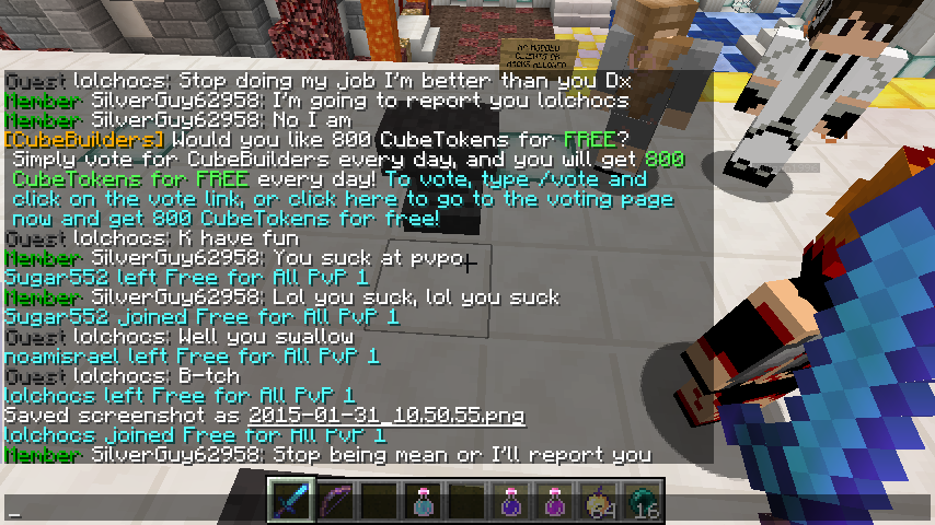 Abusers: SilverGuy / lolchocsTime: January 31, 2015 at 10:51Action: Just being inappropriate.