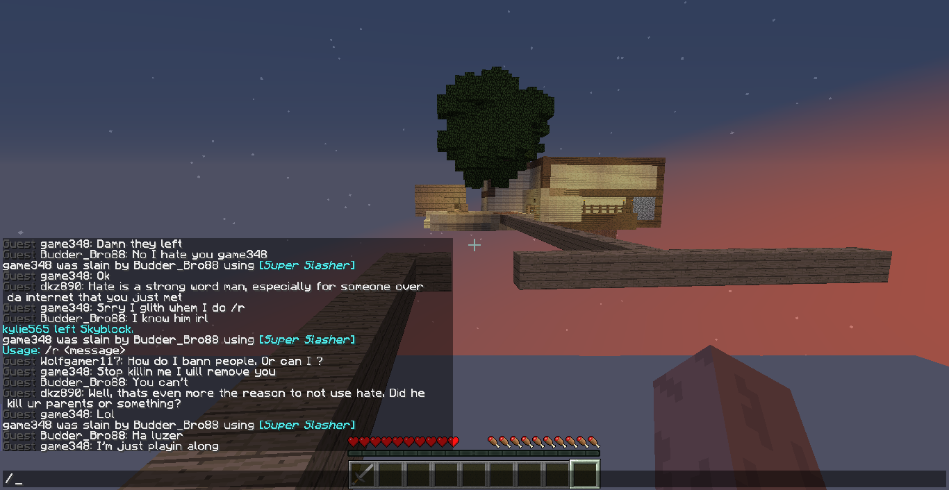 budder_bro88 was tp killing on the skyblock server and not returning the stolen items, even 15 minutes after the killings occurred, even though the players (emily_1304 and wolfgamer117) begged for it back budder_bro88 refused. he then started swearing (no screen shot available) calling the people F****** and retards.