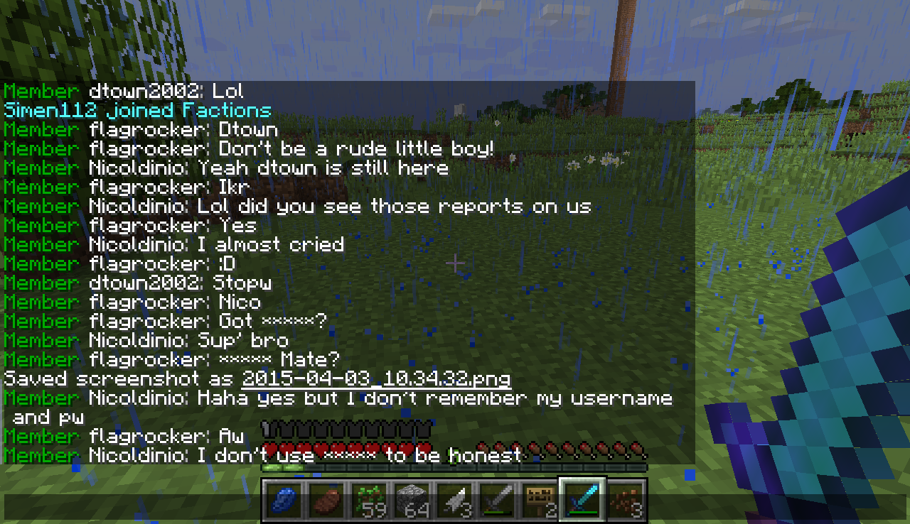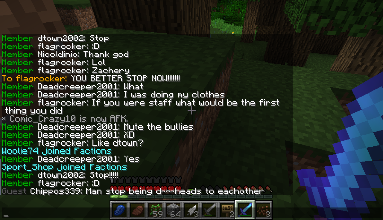 Deadcreeper, flagrocker, nicoldino, and Chippos!! Chippos was cussing, flagrocker and nicoldino where just plain being mean to me and saying Skype, and deadcreeper was saying that if he was a staff he would ban me!!!!!! April 3,2015 10:34-37 GMT-8.