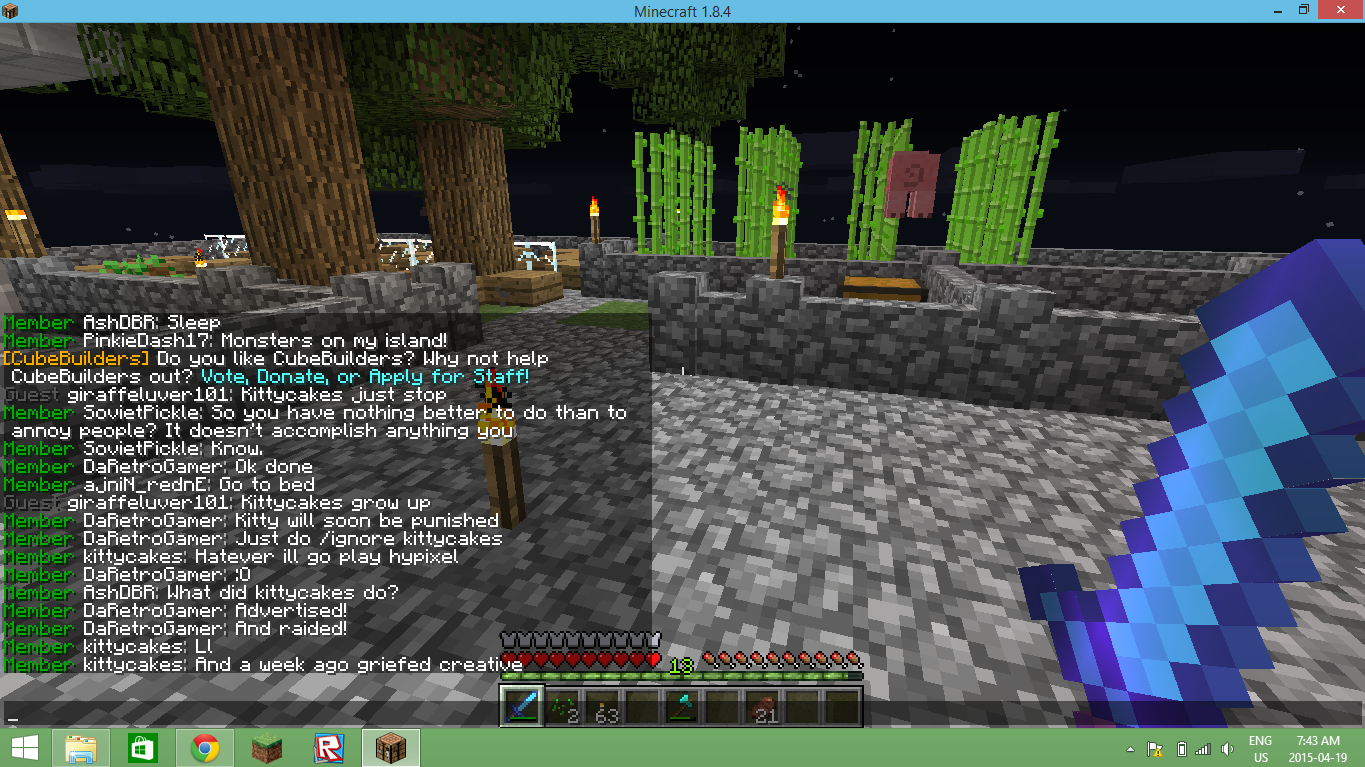 This morning I teleported kittycakes to my skyblock island and then she went up to Herocaydens farm and broke a bunch of his crops and she stole all his seeds. When I asked her to give them back she said no and simply walked away.