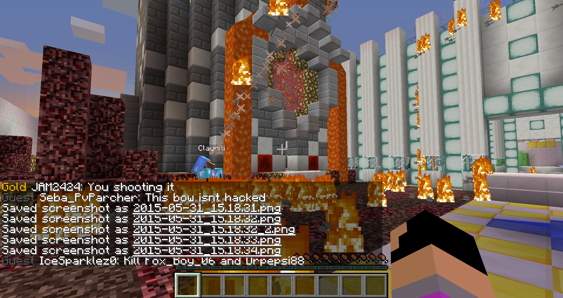 This happened on May 31st 2015, 3:20 Central Time (GMT+5 I think). Cluaditi had rapid fire bow. Hacked Client: "Wurst".