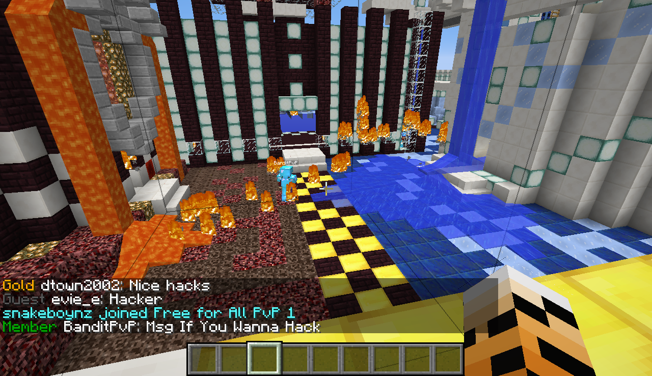 I found someone hacking today (forgot username look in screenshot) He was using Bow auto aim, kill aurora, fly, sword auto aim, bow rapid shot. July 8, 2015 6:01pm GMT-7. (Not all hacks are seen in screenshot but they where used trust me).