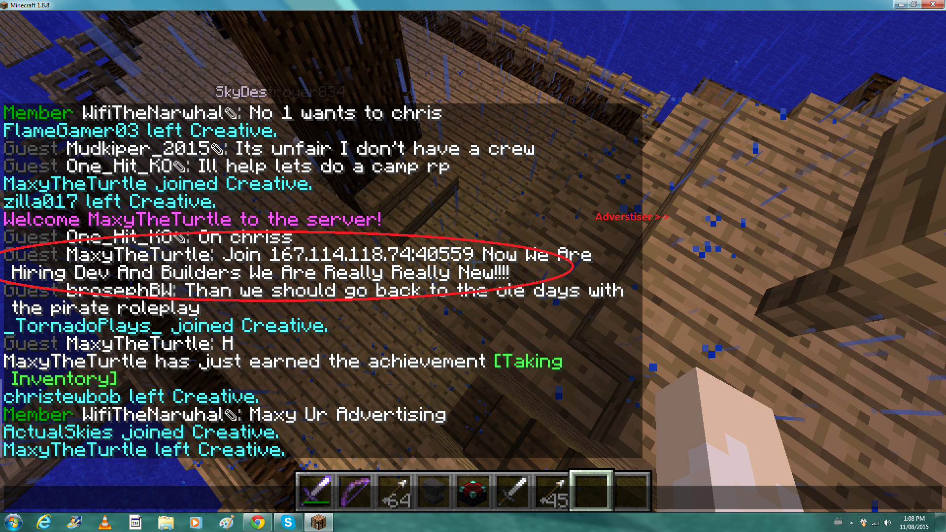 Please Deal With MaxyTheTurtle, He Was Advertising An IP Adress via Chat. Love Ya :)