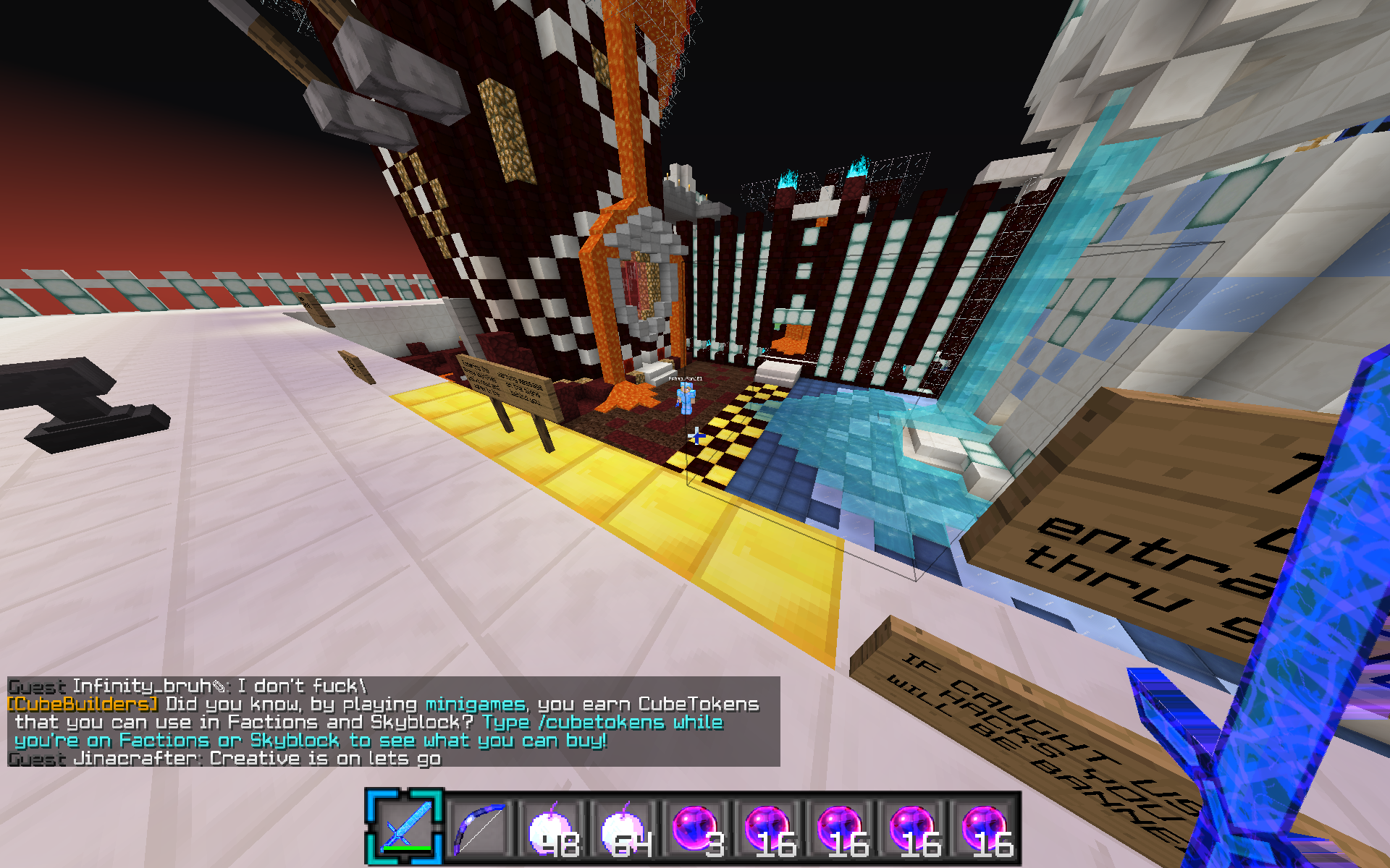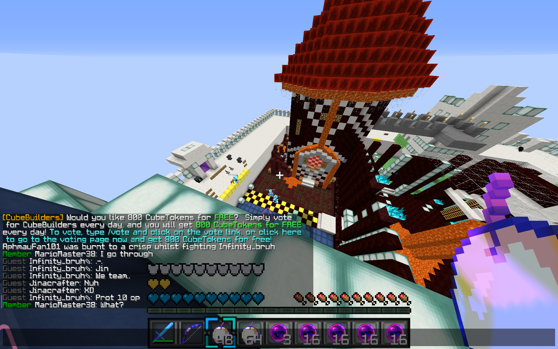 So... I was fooling around with my friends on FFA PvP when this user named Infinity_bruh pops in admitting that he has Protection X (10) on his armor, something you can only get through hacking on the server unless youre a certain level of staff. Here, he said it in the chat. You can see what I mean in the screenshot. Please make sure he destroys his armor and weapons, as those may be hacked as well.