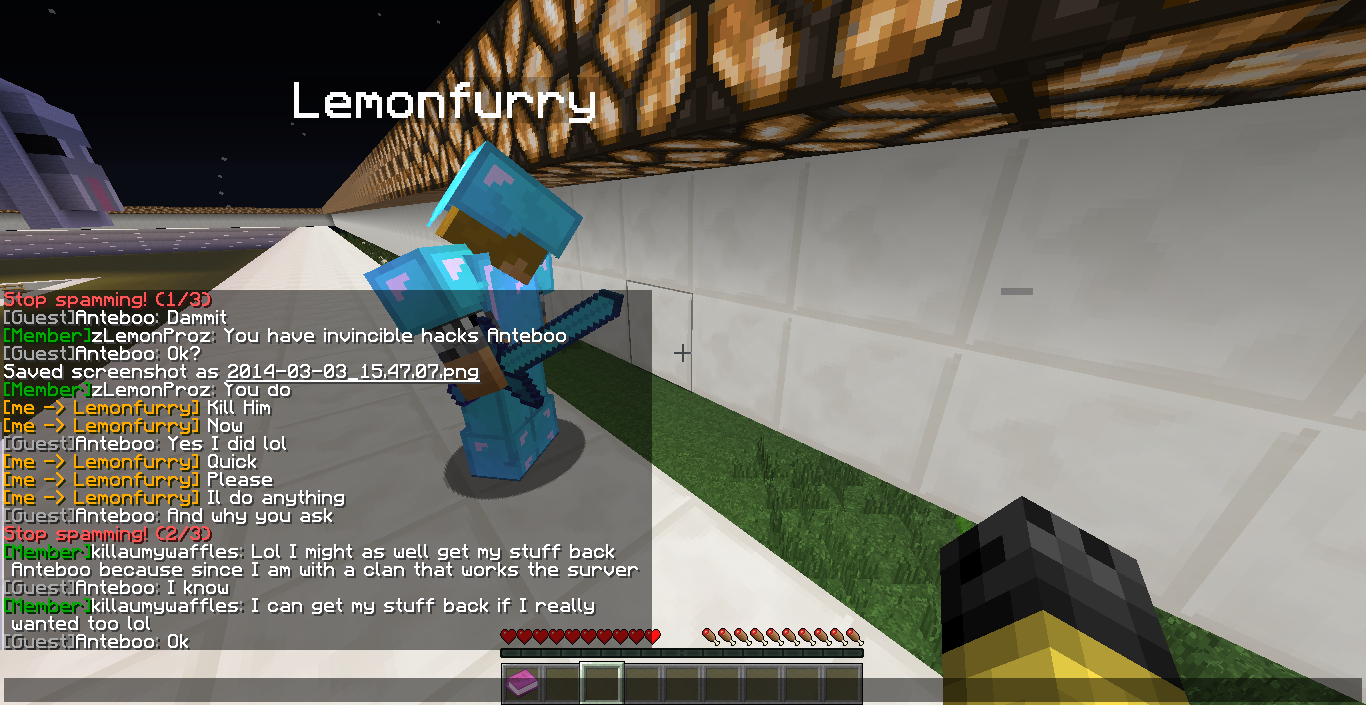 Then today, i goto the warzone, looking for a pvp battle and find Anteboo who instantly comes to me. Anteboo is a Guest rank on the server and has little items. We both charged at each other, and i started hitting him with my Super Slasher sword from cubetokens. I had hit him more than 10 times and without armor you would expect him to die. He was holding a stone axe and killed me very quickly. At that moment i had LOADS of things in my inventory including all my diamond tools, armor, all my blocks that i needed, spending much time getting and i just lost it all. Instantly panicking, i opened cubetokens and bought another diamond sword. I went back to warzone and tried to kill him. This time i hit him many more times (something like 20) and he still wouldnt die. He didnt have any armor on or no potions. He used his stone tools and killed me again. I am now literally very annoyed and feel like never playing the server again (trust me i will play this forever).