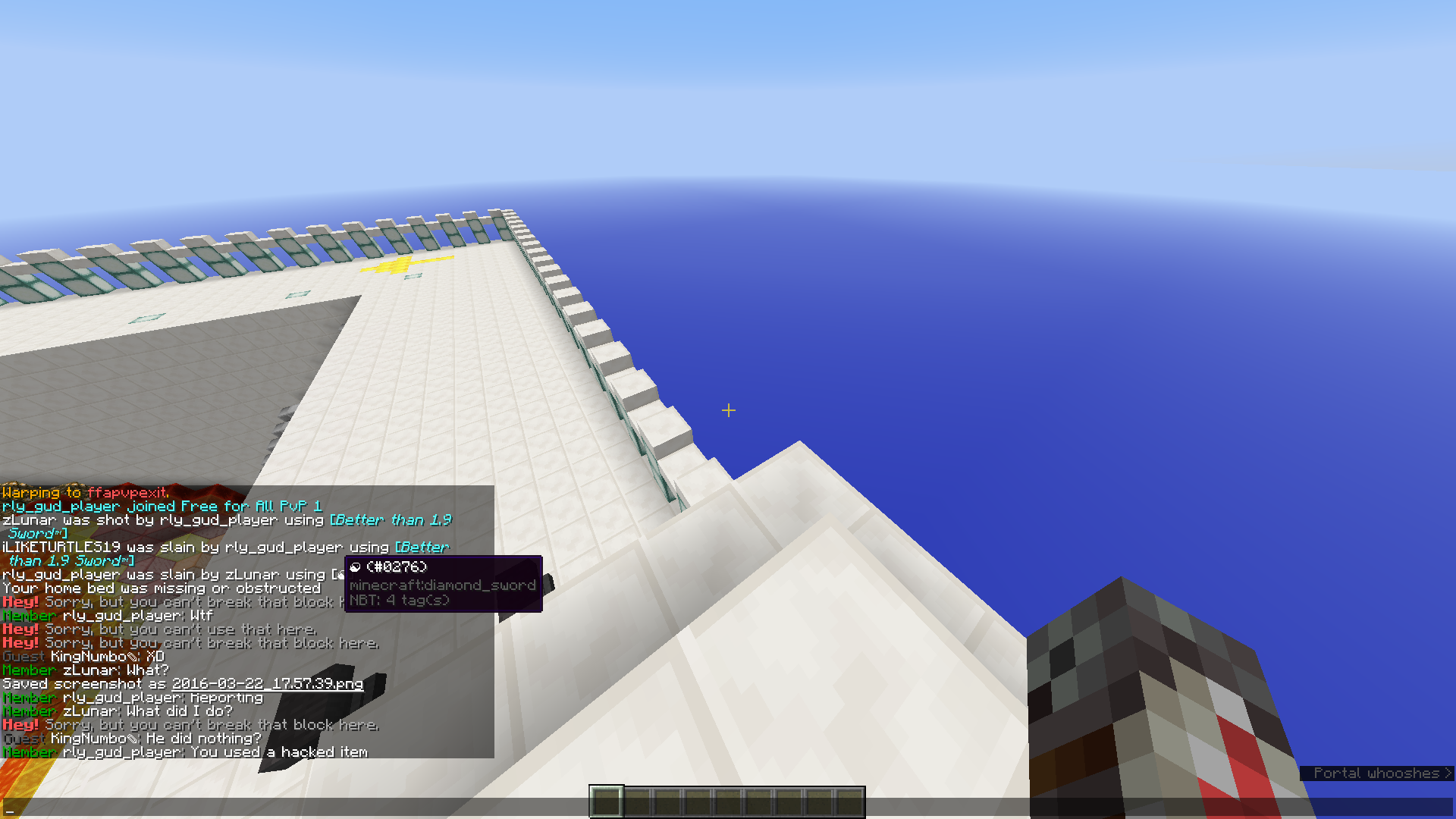 When I was pvping with ZLunar in ffapvp, I got 1-shotted by a item. Time: 5:58 pm utc-5 March, 22, 2015.