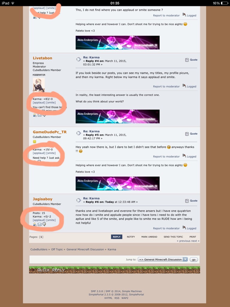 If you look beside our posts, you can see my name, my titles, my profile picure, and then my karma. Right below my karma it says applaud and smite.