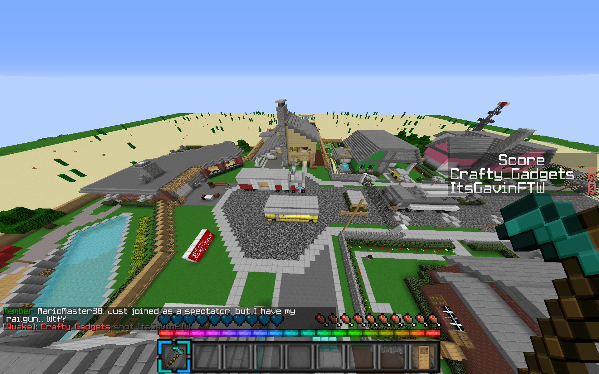 So, I decided to spectate 2 people in Quake, but then, when I joined, for some reason, I got my RailGun as a spectator. I couldnt shoot it, but also, I couldnt use the door that would take me back to the minigames lobby. I was flying in the screenshot to show Im spectating, but if youre skeptical and think Im hacking, scroll the picture to the right and check the scoreboard, my name isnt in it.