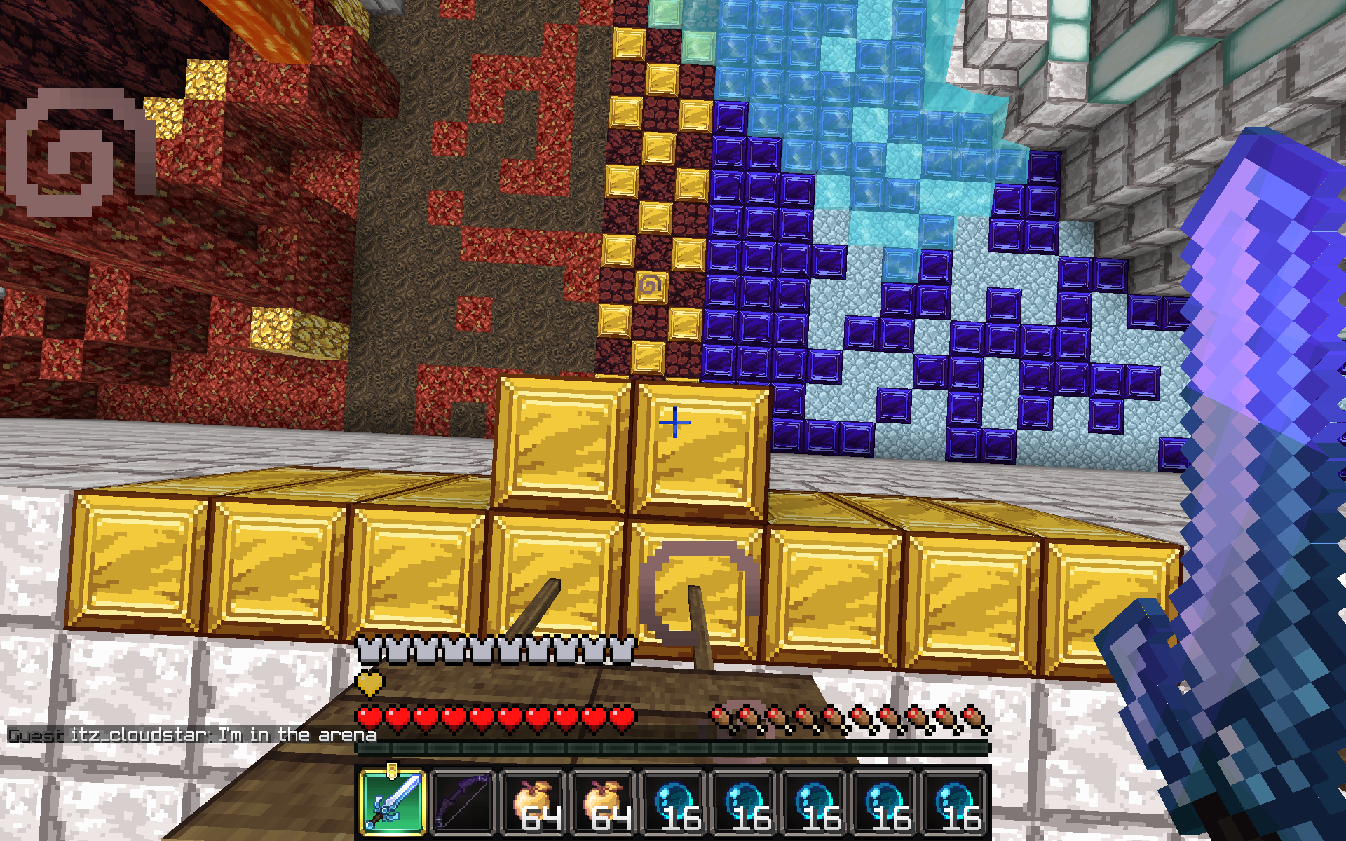 So I went on FFA PvP today when I was giving my friend a tour, and I found the front entrance to the arena was blocked off. I have no idea whether it was a bug or not, but by standing on the gold that was barricading the front entrance to the arena, I was put in survival mode as if I WERE in the arena. Please check the screenshot to see more. (Things may look a bit weird due to the fact that I was using the AD Reforged texture pack at the time of the screenshot)